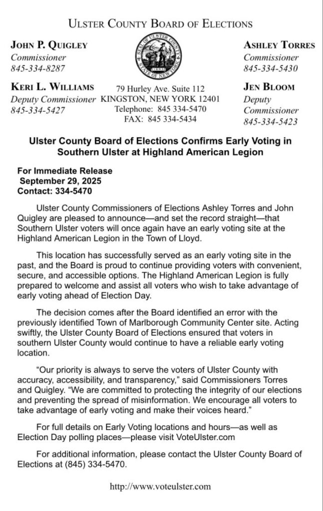 Southern Ulster County voters will no longer have access to an early voting site in Marlborough this fall. The Ulster County Board of Elections (BOE) confirmed that the location has been relocated from the Marlborough Community Center to the Highland American Legion. The BOE website has also been updated with a revised map showing the change.