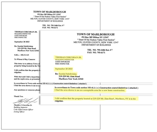 In affirming that determination, the Town’s position has been clarified after more than a year of public hearings and county review. The ZBA emphasized statutory context; the phrase “highest elevation of the Marlborough ridgeline, as viewed from the east,” the Board concluded, refers to the mapped ridgeline segment affecting the property, not a distant, higher peak elsewhere in town.